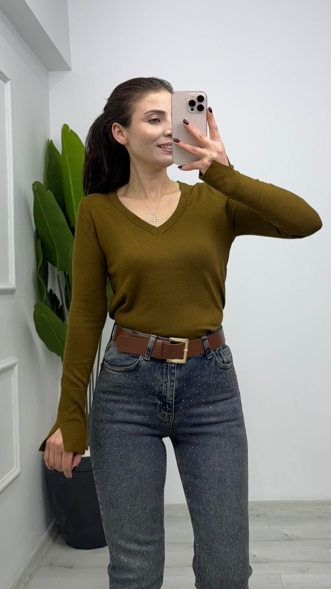 10427 V Yaka Kolu Yırtmaçlı Triko Kazak Yağ Yeşili