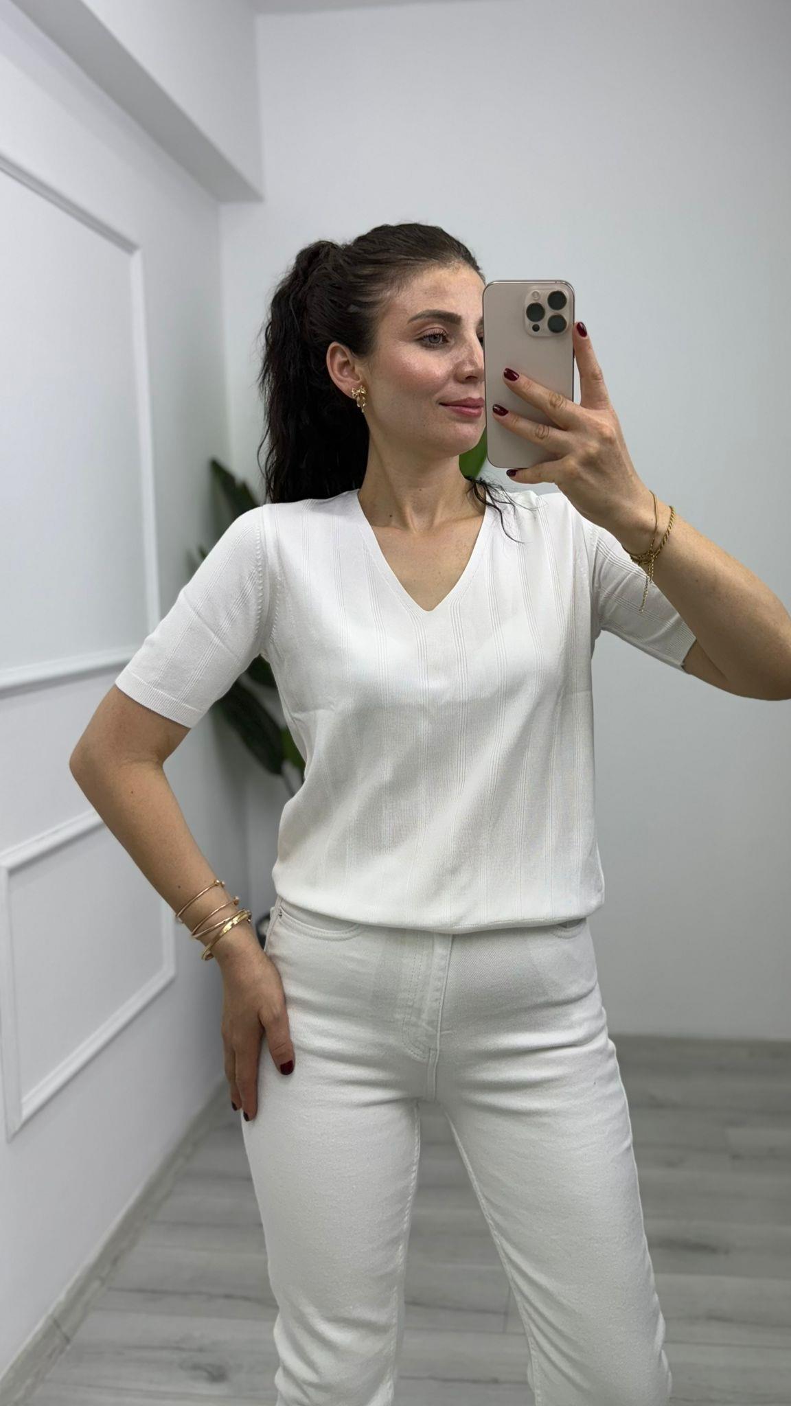 1324 V Yaka Özel Çizgi Detaylı Kısa Kol Triko Beyaz
