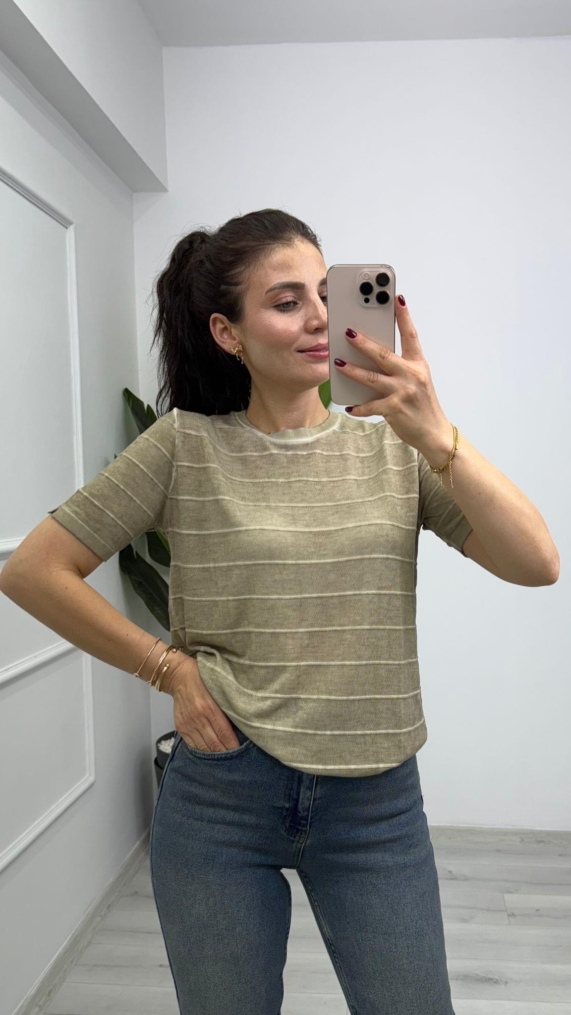 1325 Bisiklet Yaka Yan Çizgi Detaylı Kısa Kol Triko Haki