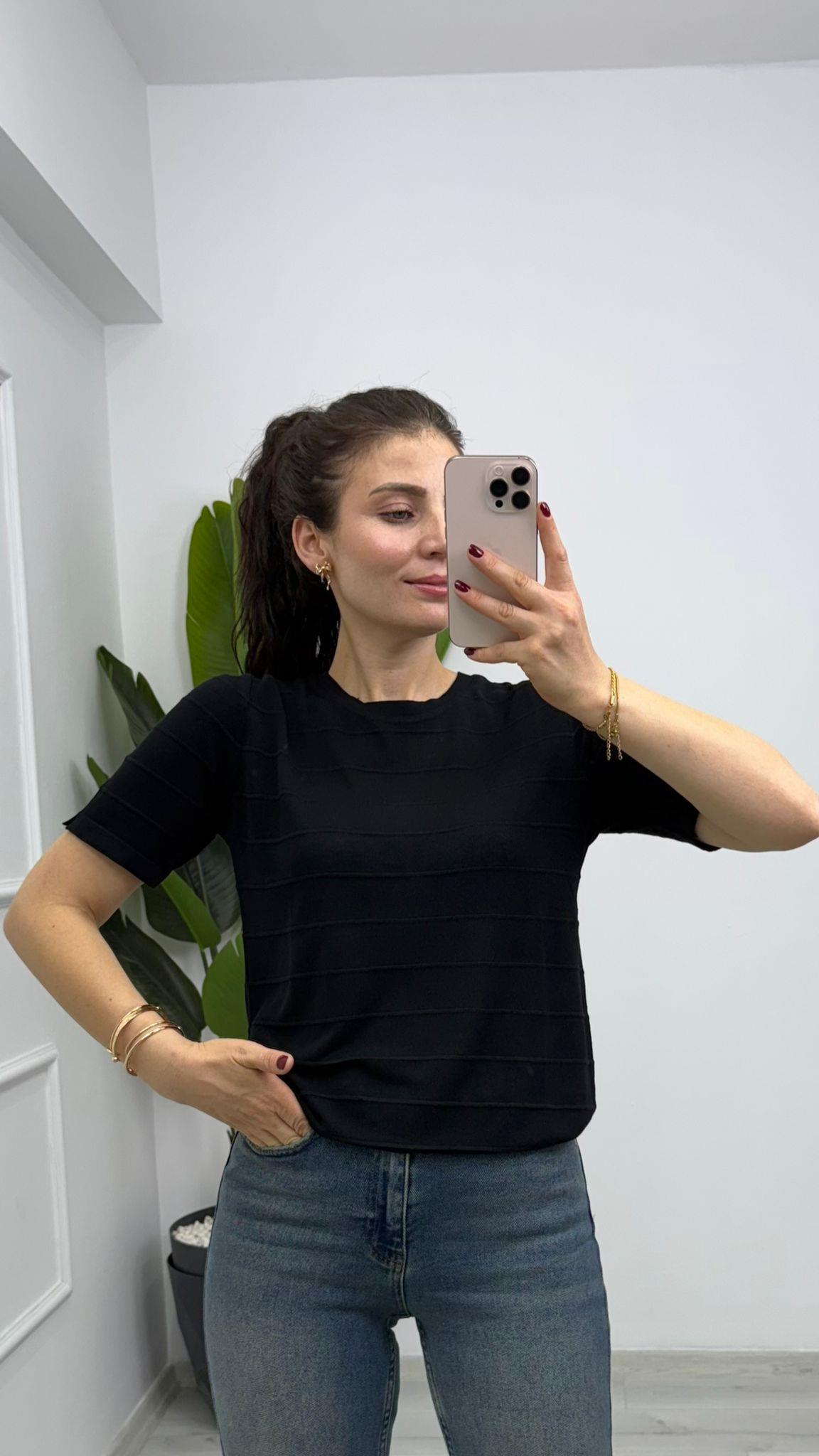 1325 Bisiklet Yaka Yan Çizgi Detaylı Kısa Kol Triko Siyah