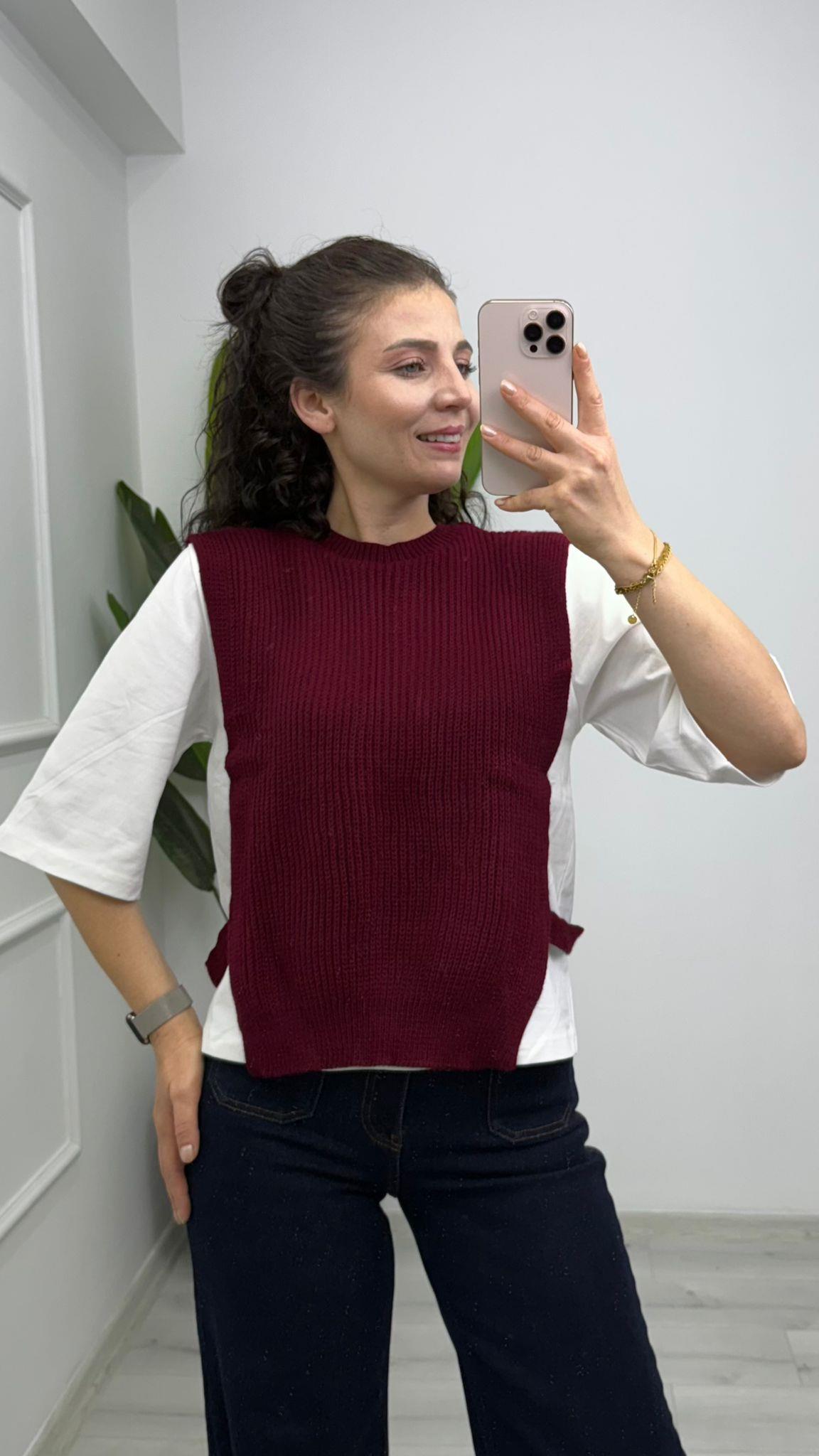 1334 Triko Süveter Detaylı İkili Tişört Takım Bordo