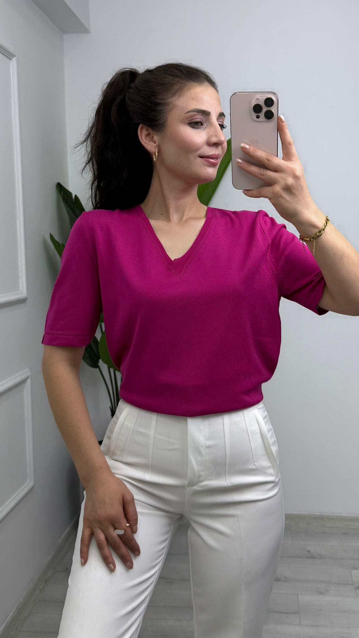 1838 V Yaka Dikiş Detaylı Triko Bluz Fuşya