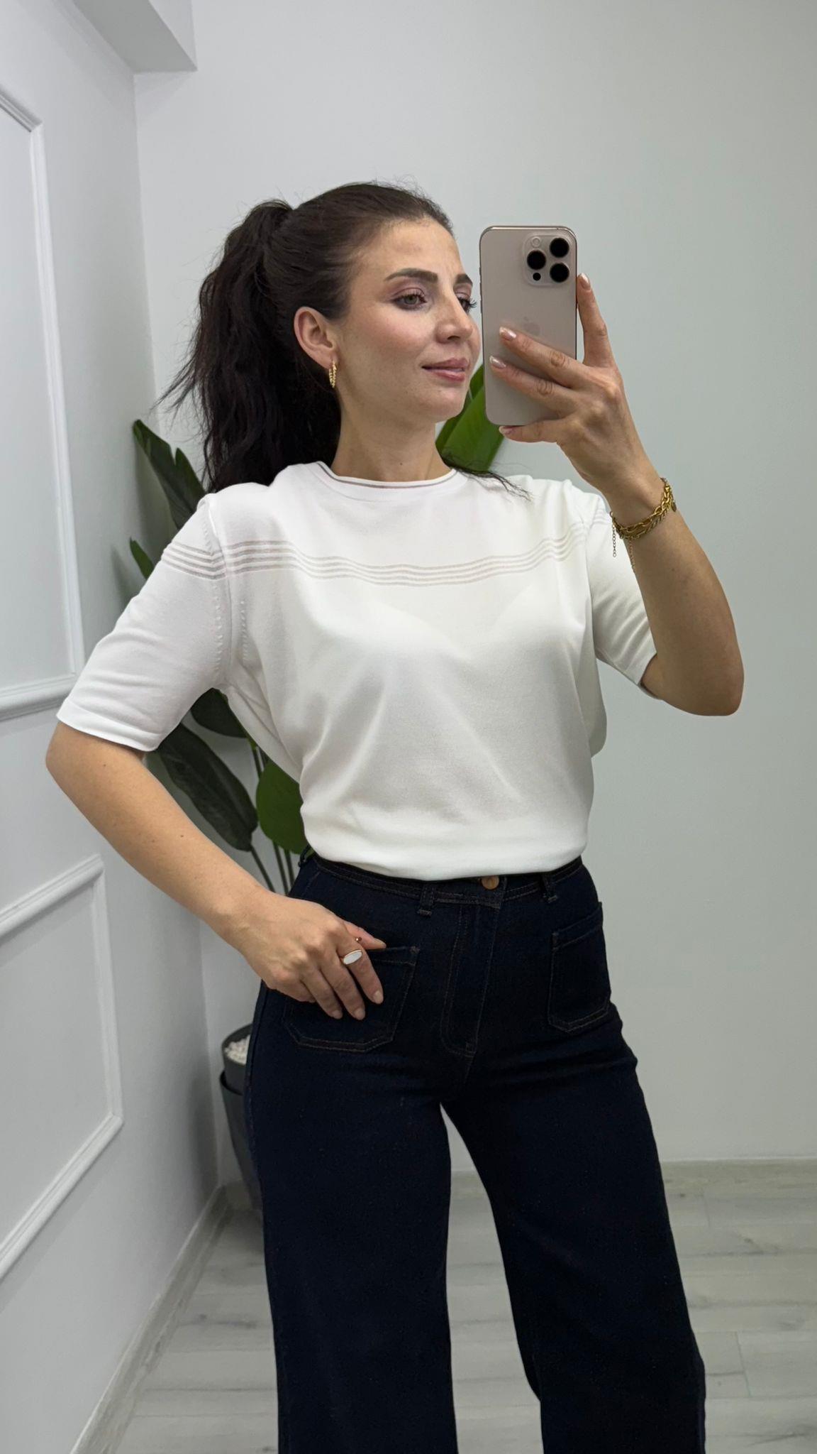 1851 Bisiklet Yaka Dikiş Detaylı Triko Beyaz