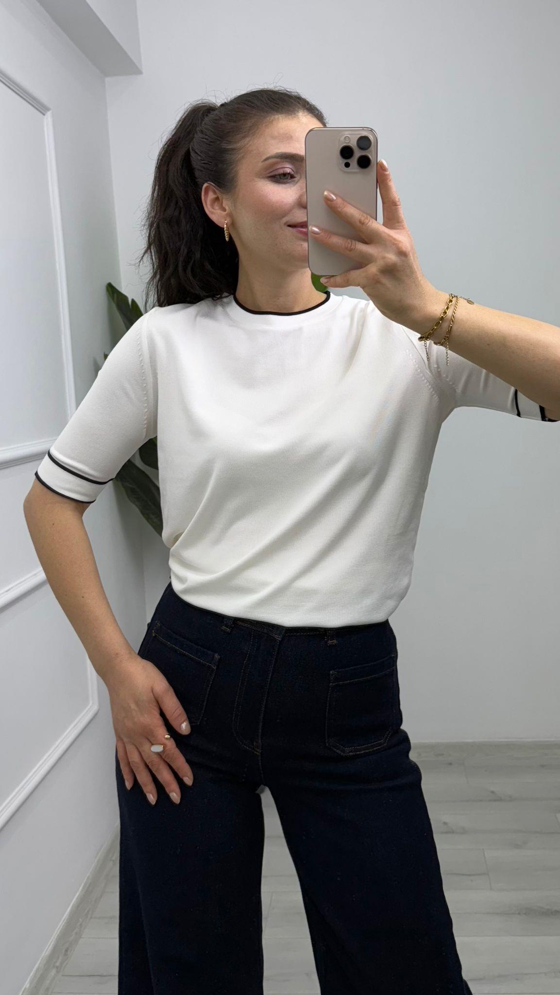 1879 Bisiklet Yaka Damla Ve Şerit Detaylı Triko Bluz Beyaz