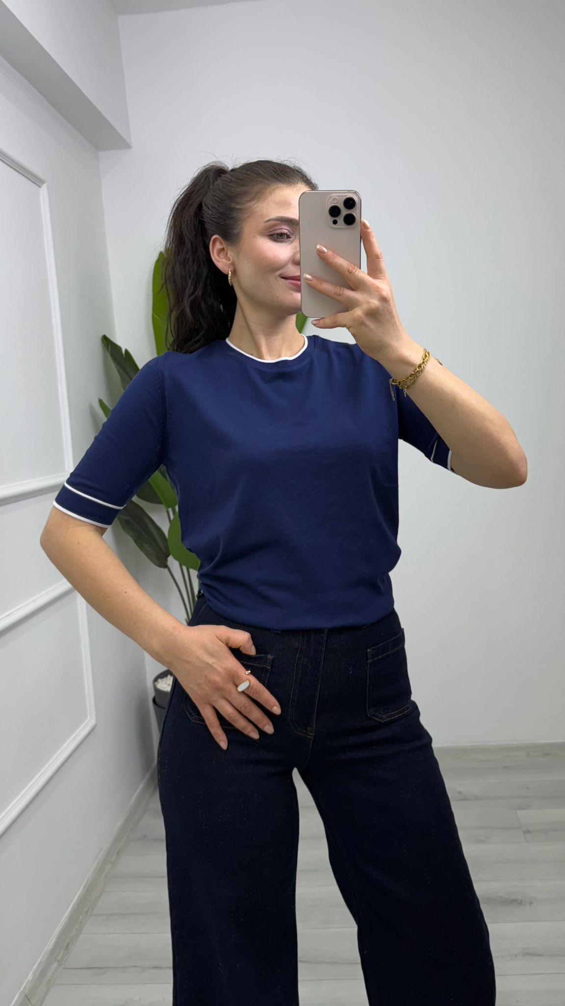BİSİKLET YAKA YAKA VE KOL UCU ŞERİT DETAYLI SIRT KISMI DAMLA DETAYLI MERSERİZE TRİKO BLUZ