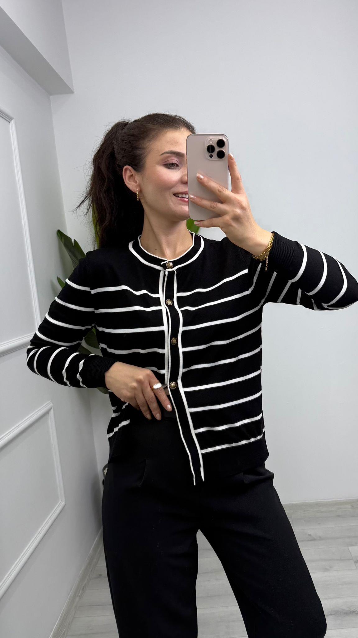 2179 Bisiklet Yakalı Şerit Detaylı Triko Hırka Siyah