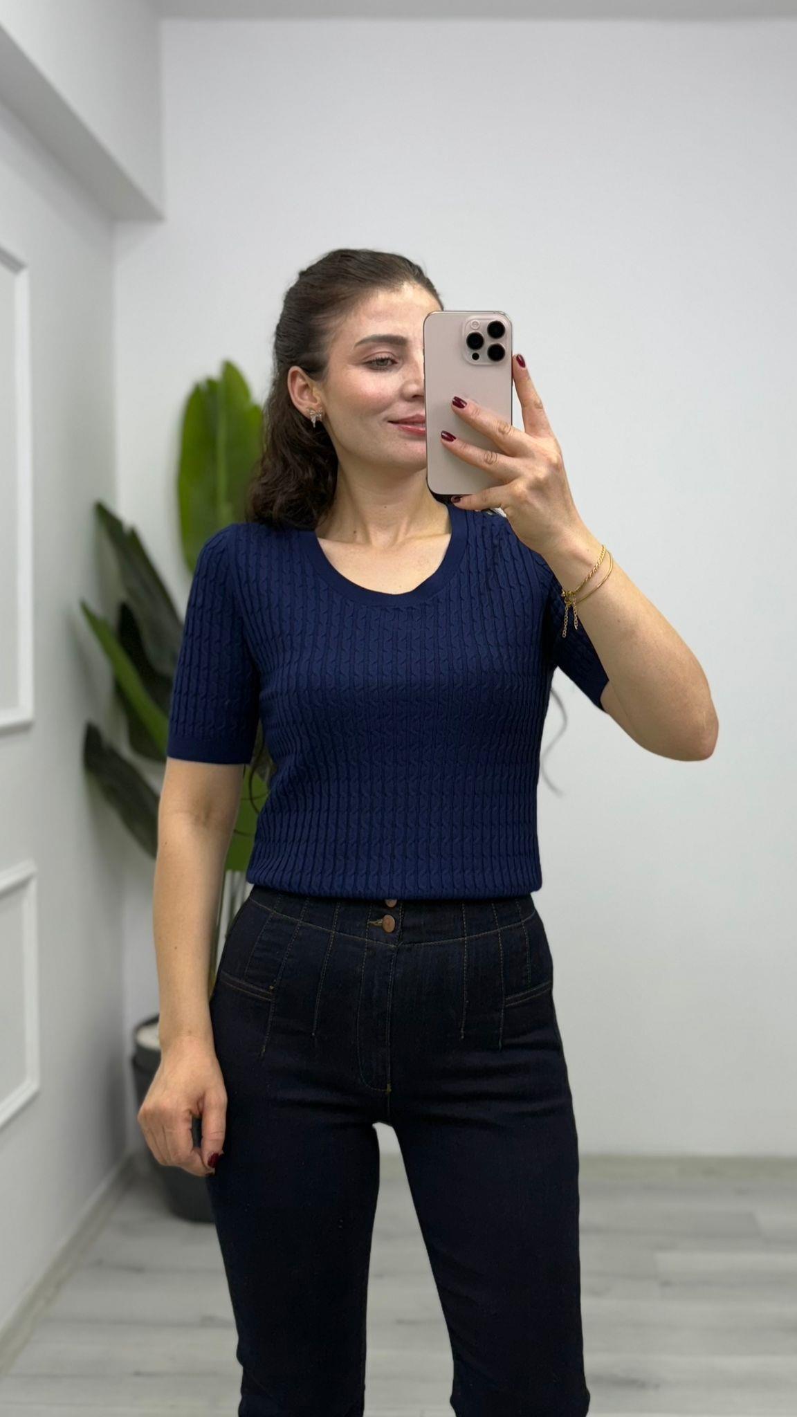 2612 U Yaka Örgü Detay Triko Lacivert
