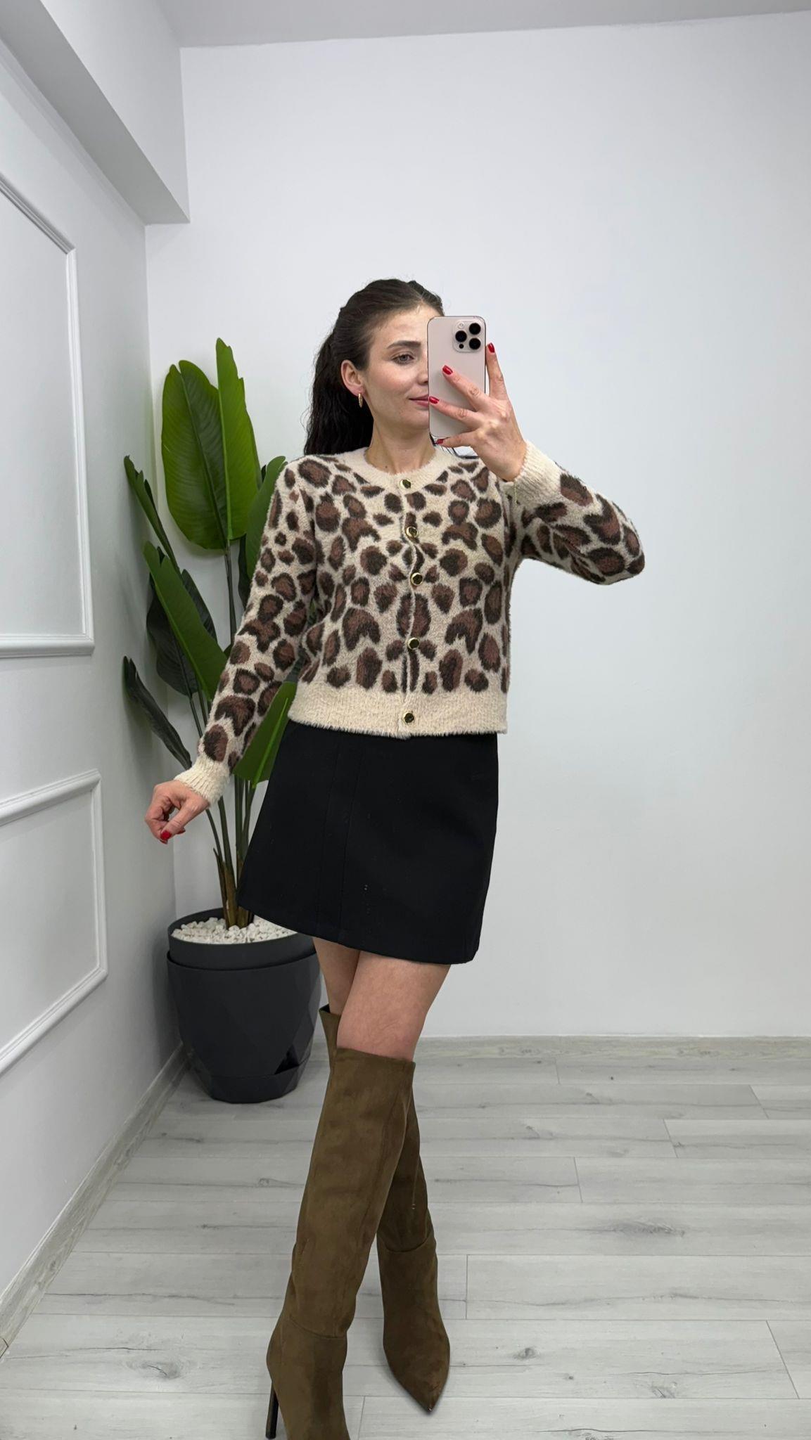 LEOPAR DESENLİ DÜĞME DETAYLI YUMOŞ HIRKA