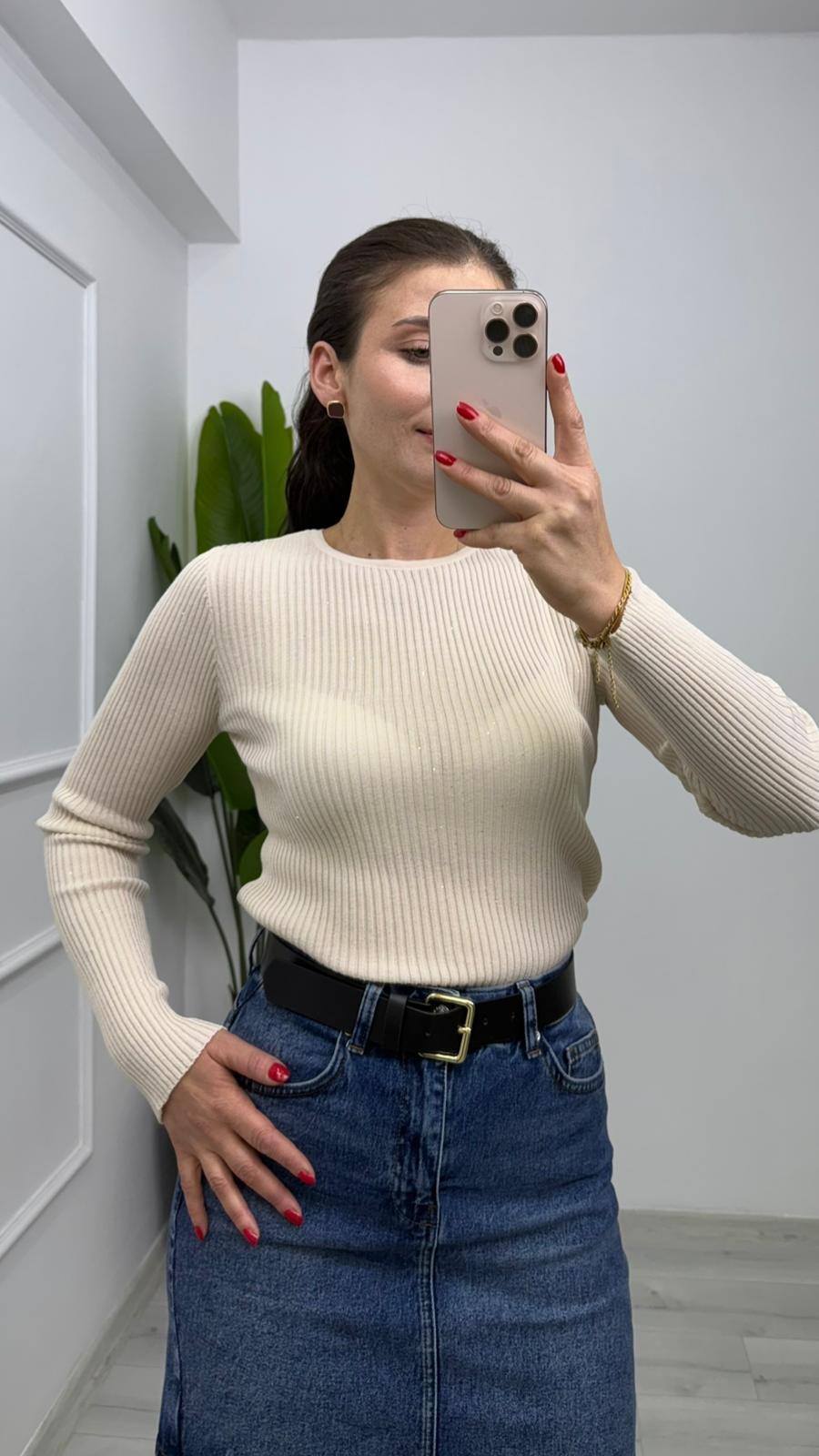 4798 Fitilli Sim Detaylı Triko Bluz Krem