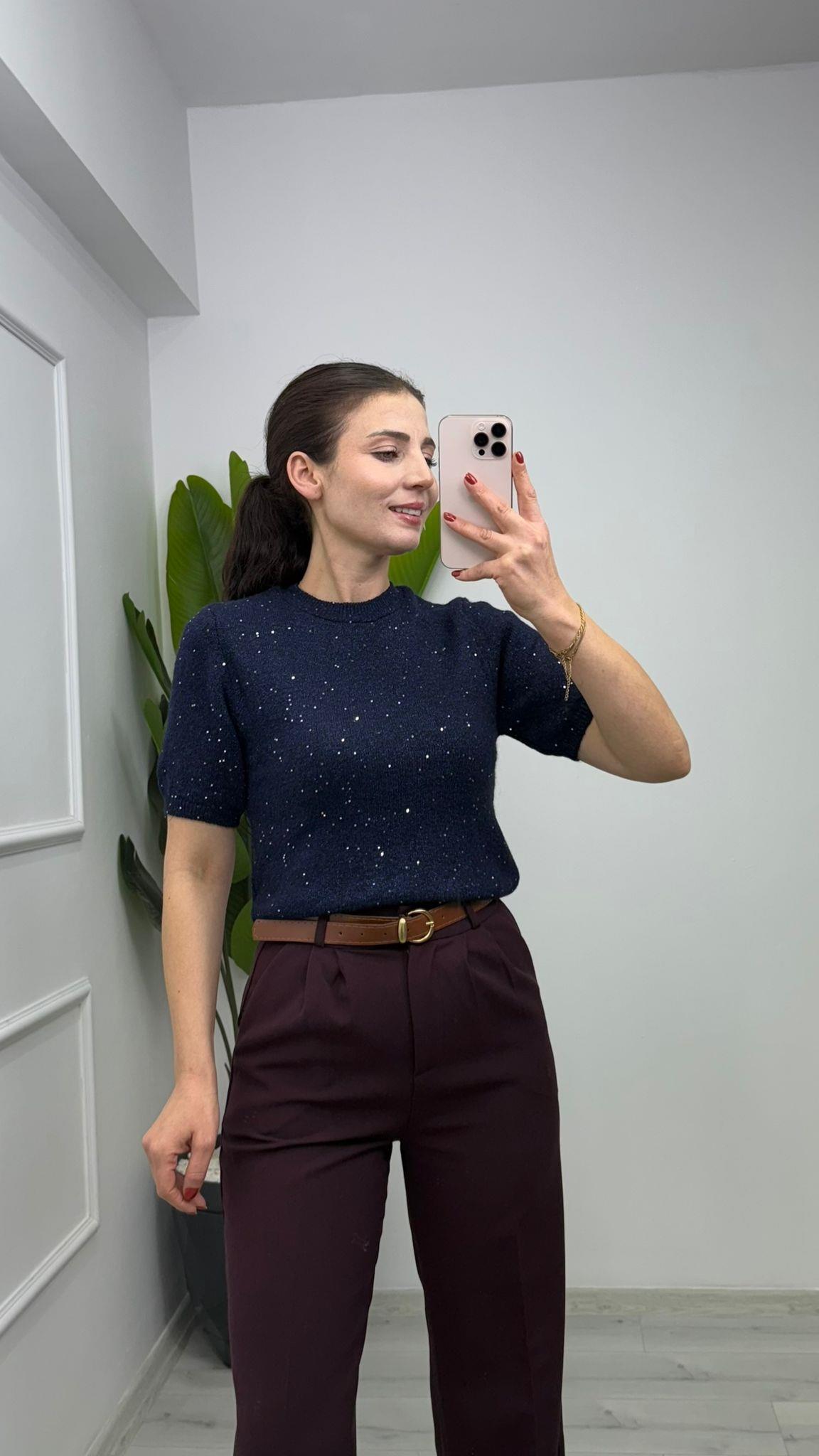 PUL PARILTILI BİSİKLET YAKA YUMUŞACIK TRİKO BLUZ