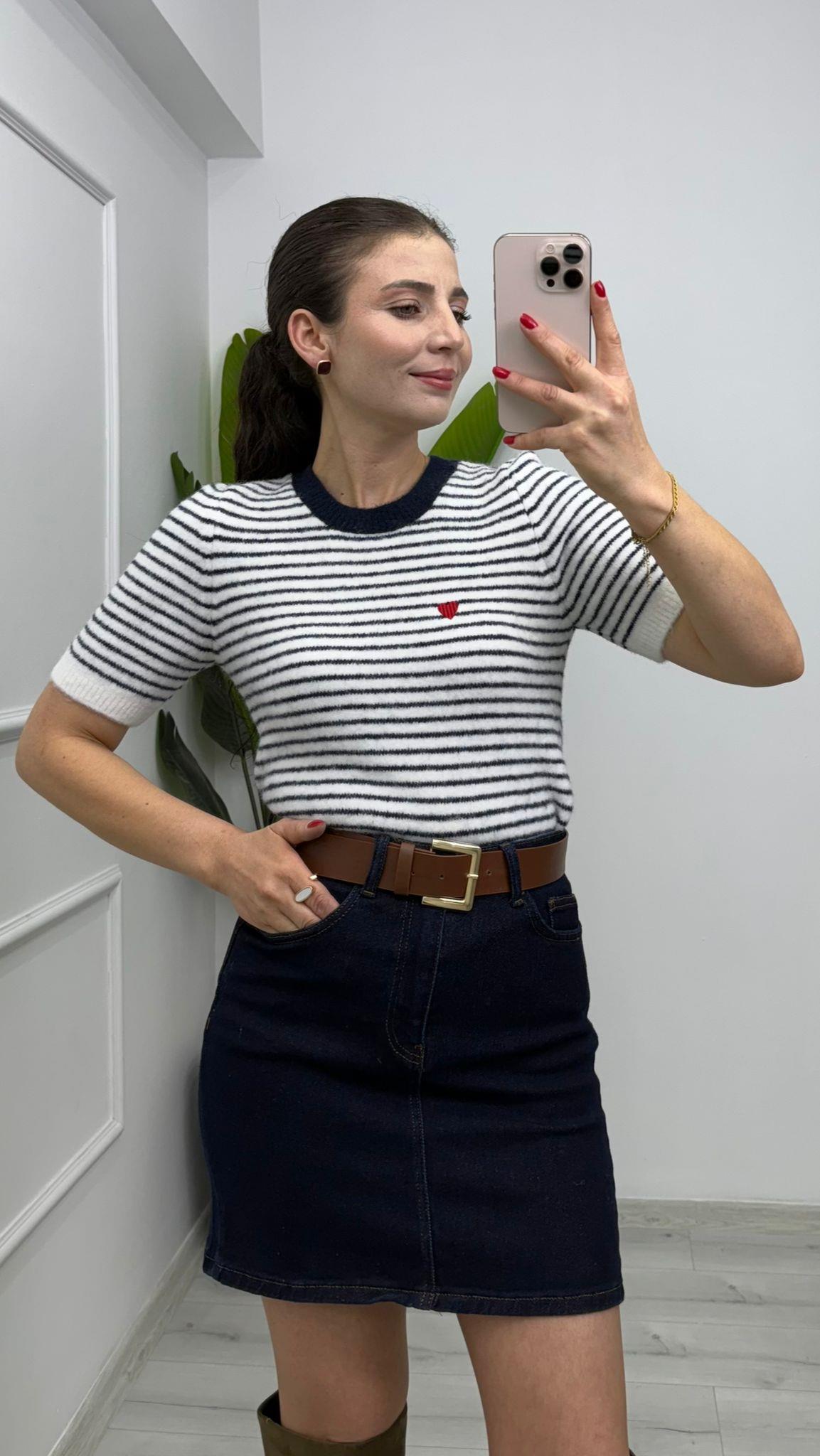 4885 İnce Çizgi Ve Nakışlı Kalp Detaylı Kısa Kollu Yumoş Triko Lacivert