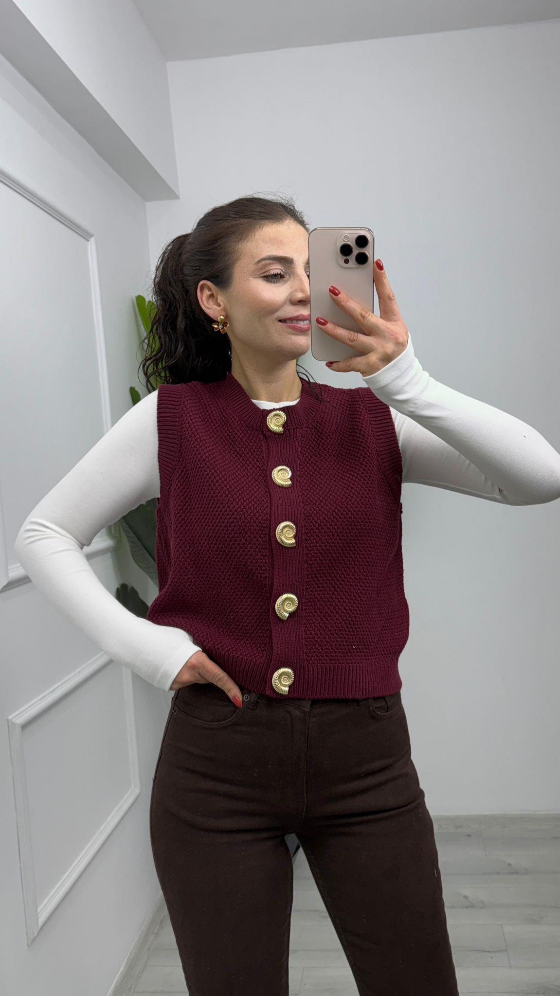 4925 Düğme Detaylı Örgü Triko Yelek Bordo