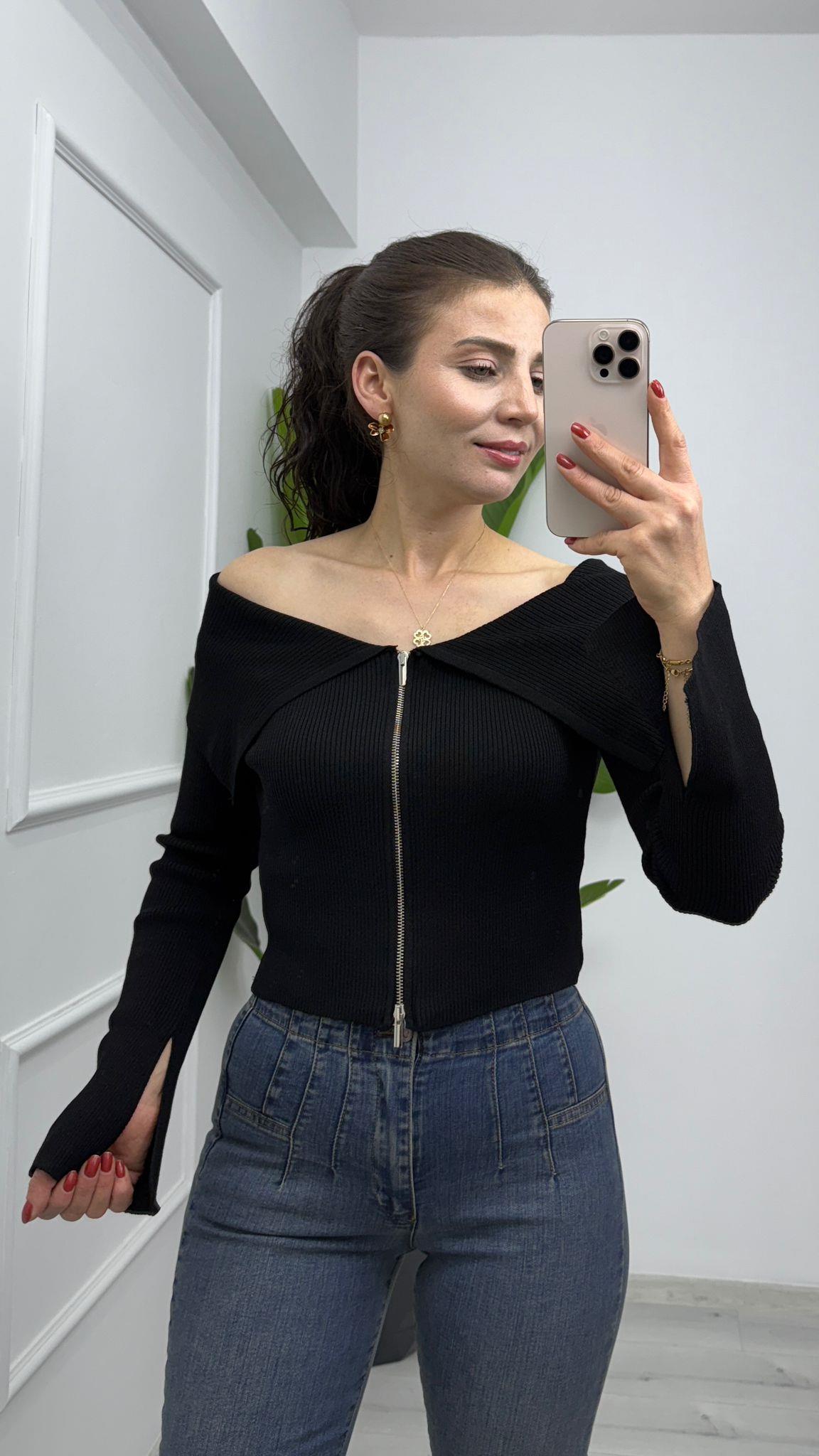 BARDOT YAKA KOLU YIRTMAÇ DETAYLI ÇİFT YÖNLÜ FERMUARLI TRİKO HIRKA