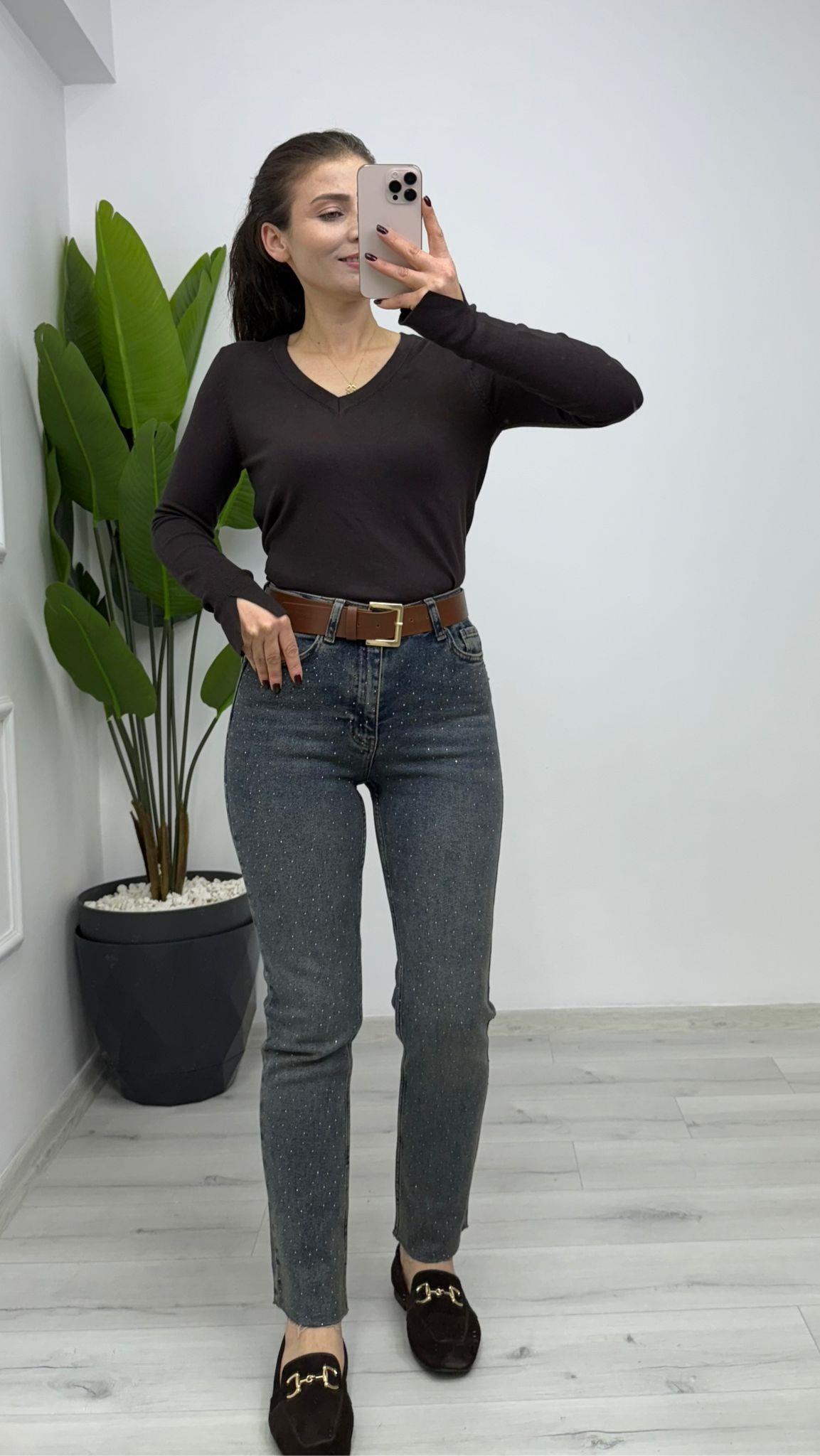 ÖNÜ TAŞLI KOYU MAVİ KAR YIKAMA TİNTİLİ KOT PANTOLON TAM KALIPTIR.