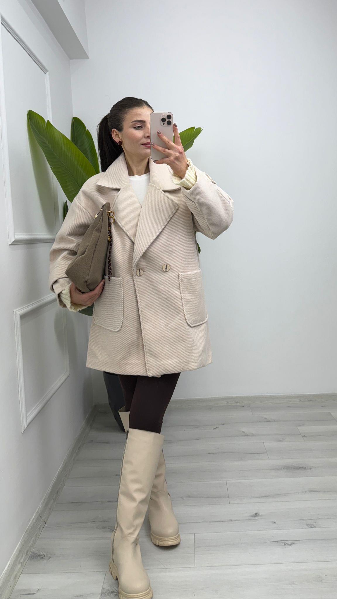 9747 Düşük Omuz Çift Cepli Düğmeli Kısa Kaban Taş