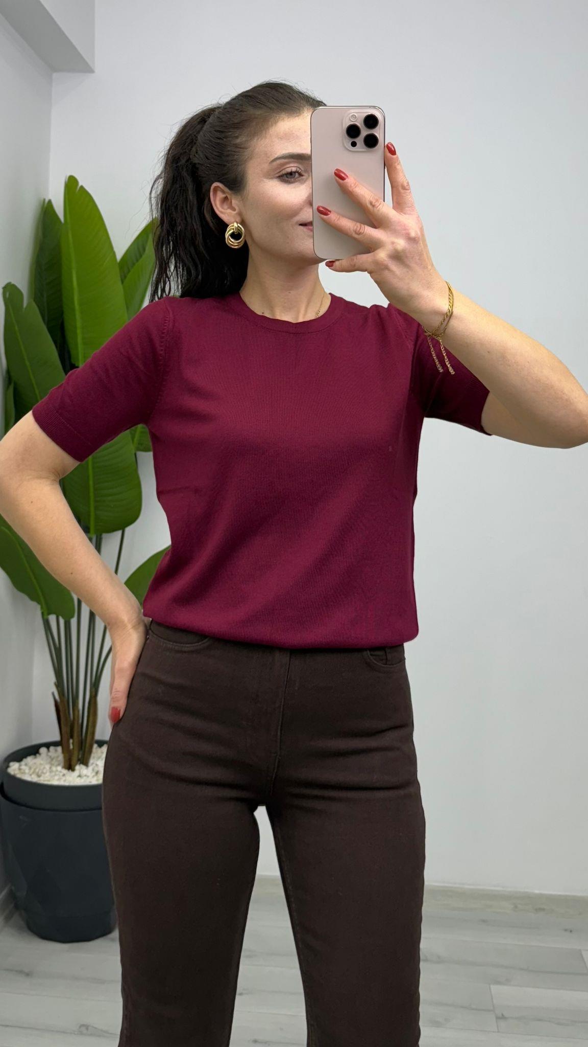 10779 Bisiklet Yaka Kısa Kol Basic Triko Bluz Bordo