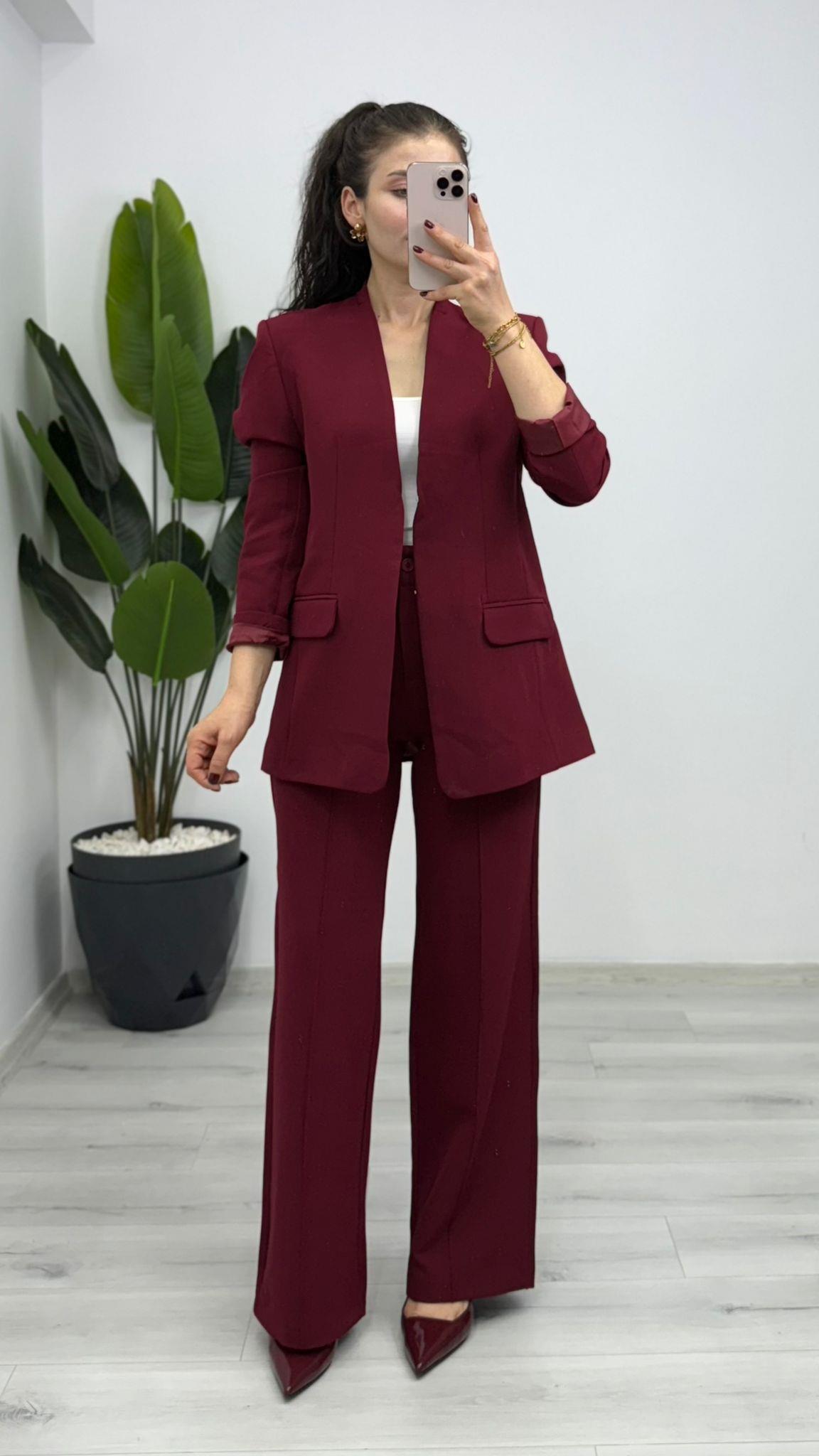 ÖNÜ ÇİFT KANCALI BALEZER CEKETLİ PALAZZO PANTOLONLU TAKIM