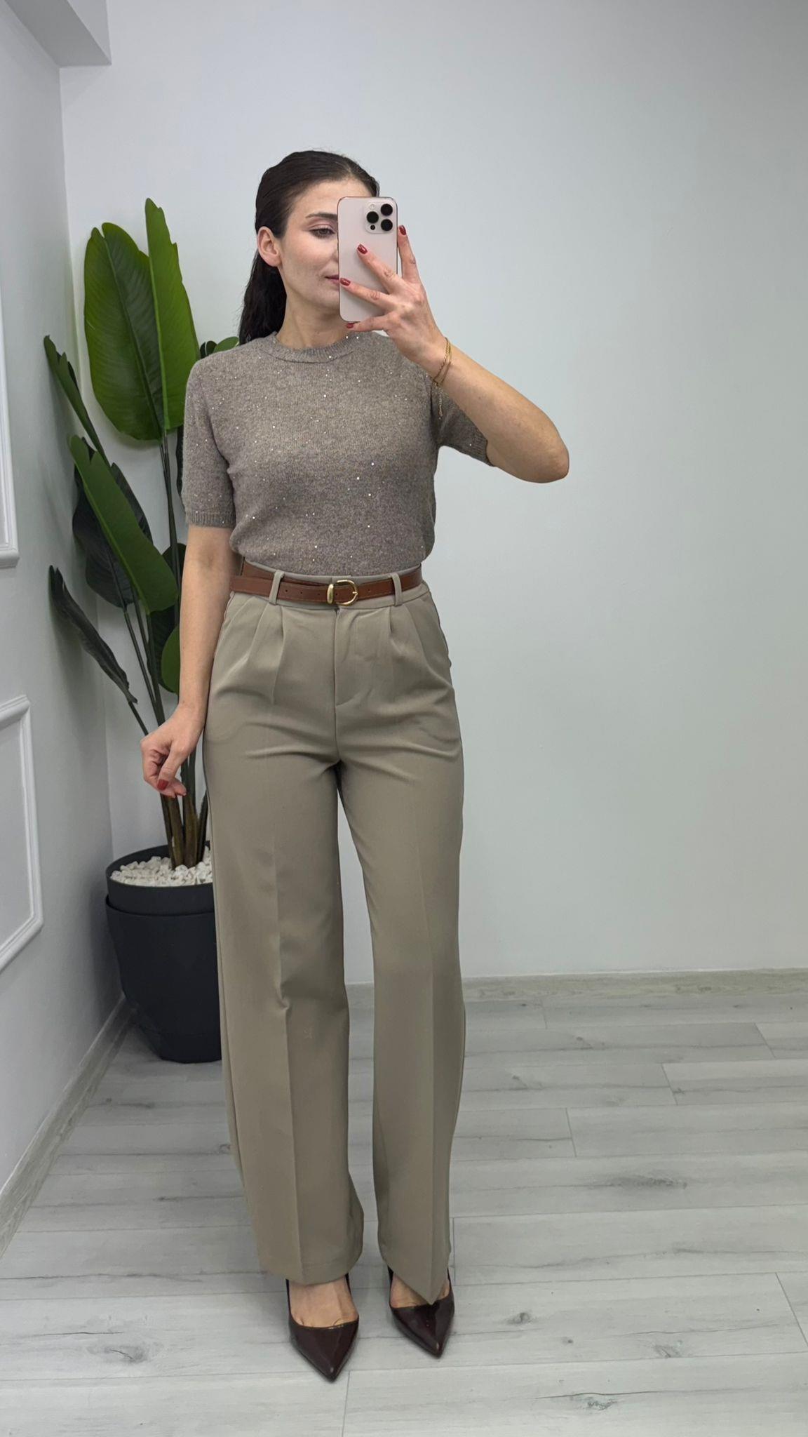 1087 Beli Lastikli Kemerli Palazzo Pantolon Vizon