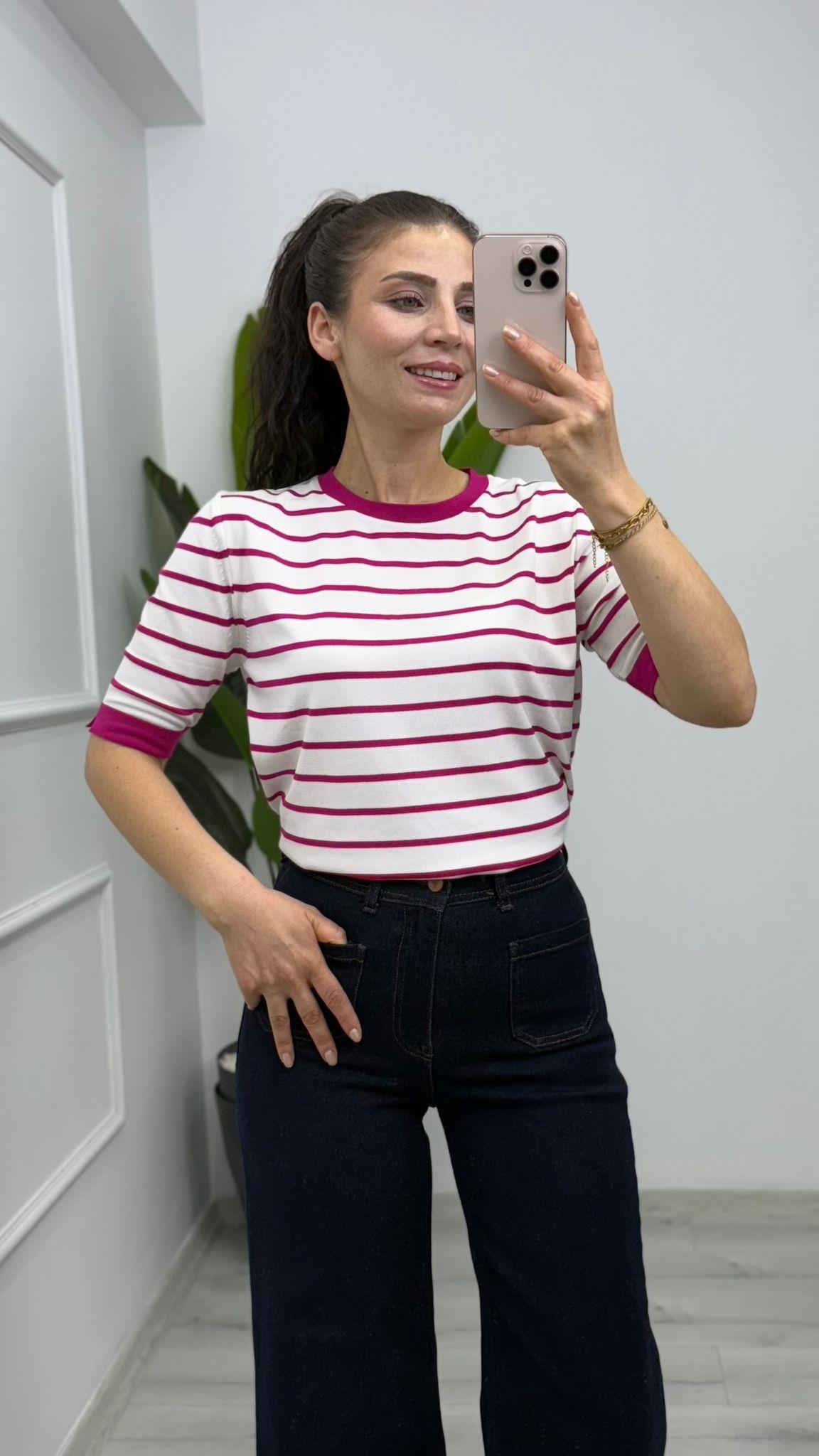 BİSİKLET YAKA YAN ŞERİT DETAYLI FUŞYA RENKLİ MERSERİZE TRİKO BLUZ