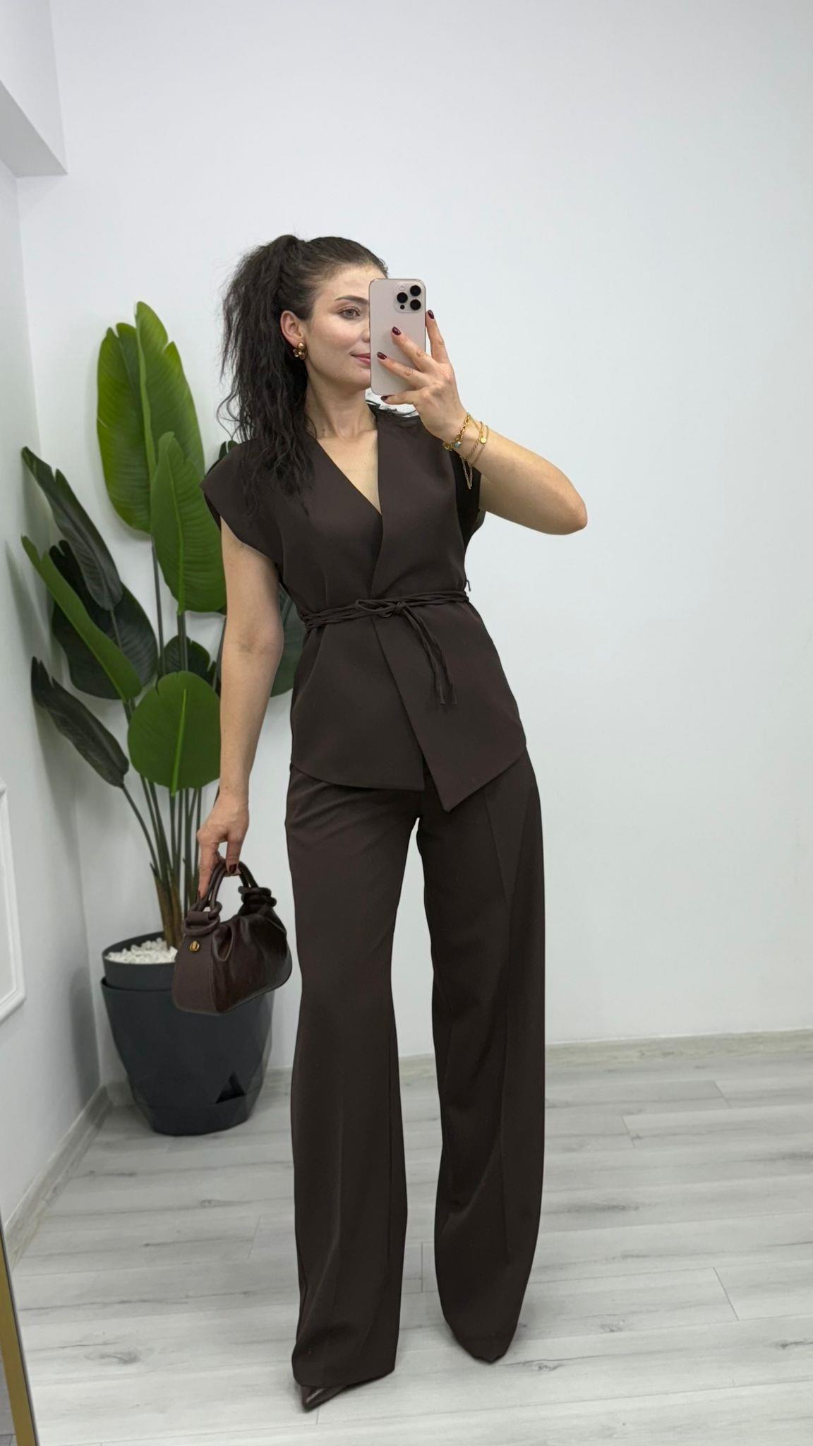 1965 Anvelop Bağacıklı Kolsuz Yelekli Takım Kahve